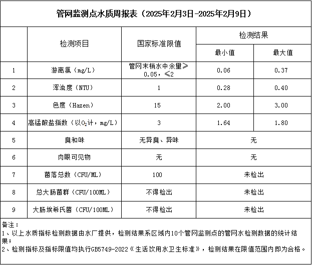 管網(wǎng)監(jiān)測(cè)點(diǎn)水質(zhì)周報(bào)表(2025年2月3日-2025年2月9日)
