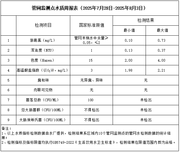 管網監(jiān)測點水質周報表(2025年7月28日-2025年8月3日)