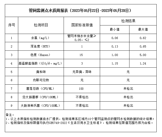 管網(wǎng)監(jiān)測點水質(zhì)周報表(2023年05月22日-2023年05月28日)