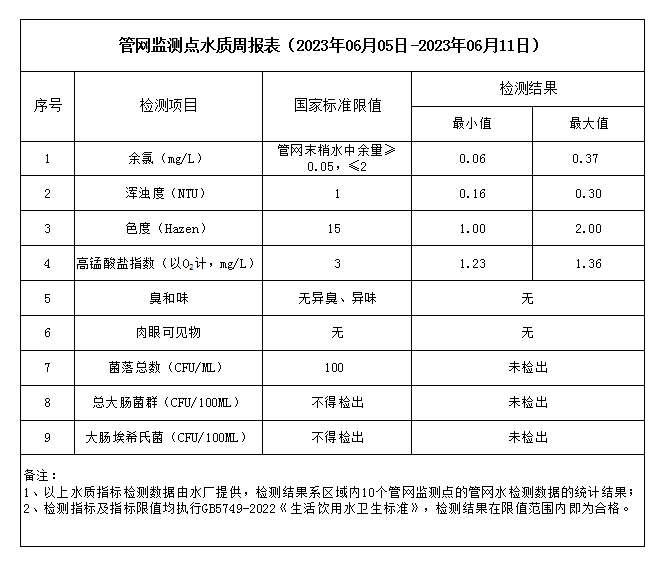 管網(wǎng)監(jiān)測點(diǎn)水質(zhì)周報表(2023年06月05日-2023年06月11日)