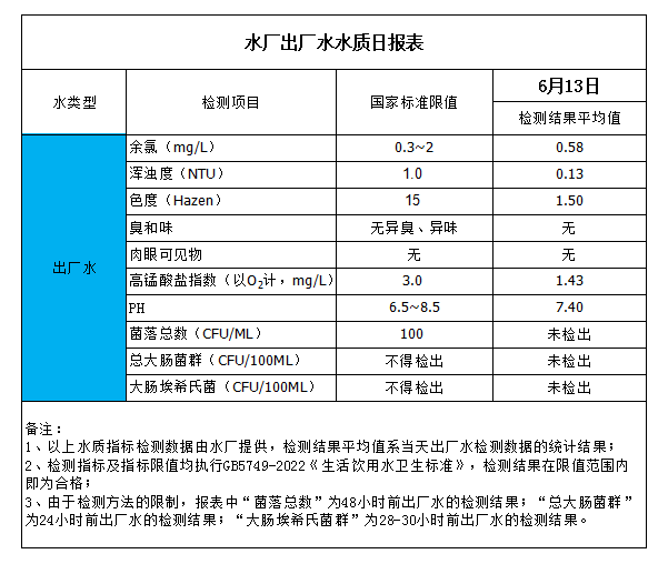 水廠出廠水水質(zhì)日?qǐng)?bào)表(2023-6-13)