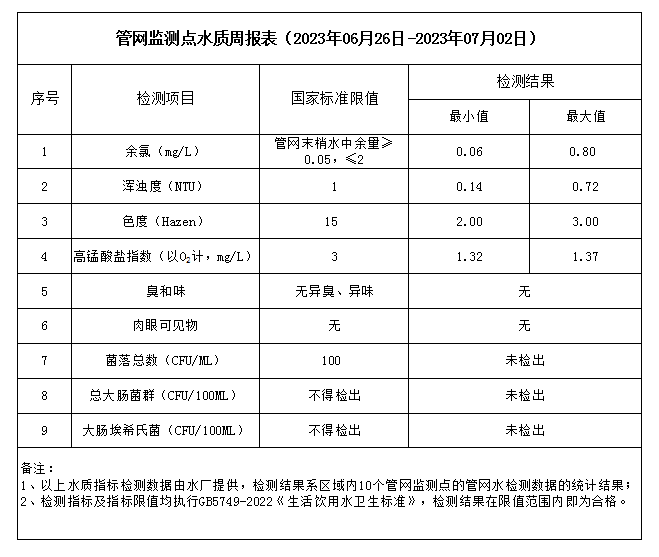 管網(wǎng)監(jiān)測(cè)點(diǎn)水質(zhì)周報(bào)表(2023年06月26日-2023年07月02日)