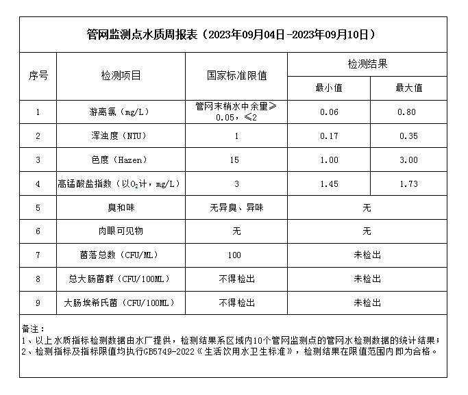 管網(wǎng)監(jiān)測點(diǎn)水質(zhì)周報表(2023年09月04日-2023年09月10日)