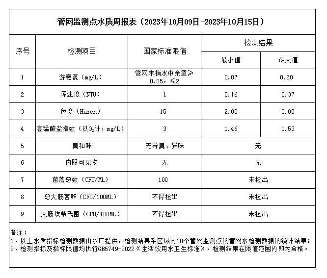 管網(wǎng)監(jiān)測(cè)點(diǎn)水質(zhì)周報(bào)表(2023年10月09日-2023年10月15日)