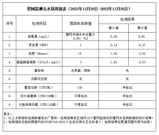 管網(wǎng)監(jiān)測(cè)點(diǎn)水質(zhì)周報(bào)表(2023年11月20日-2023年11月26日)