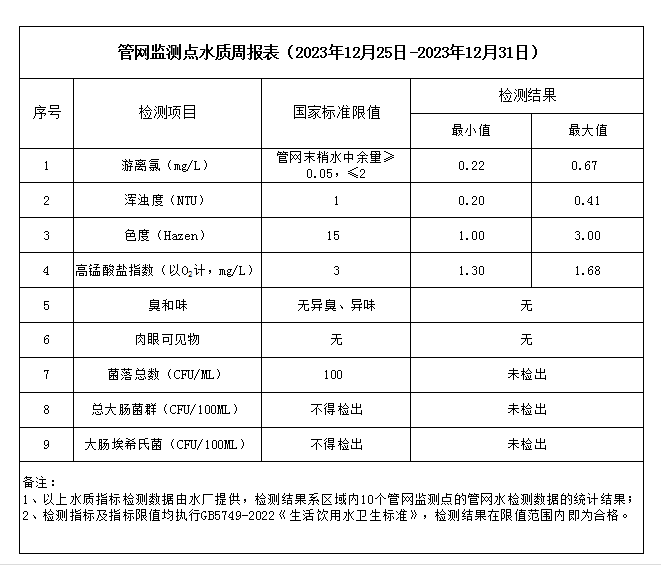 管網(wǎng)監(jiān)測點水質(zhì)周報表(2023年12月25日-2023年12月31日)