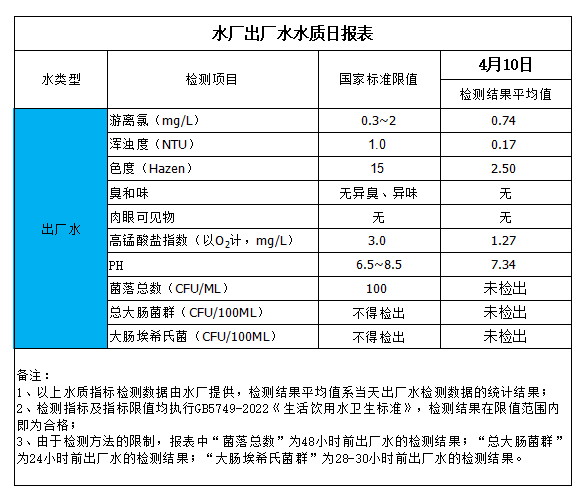 水廠出廠水水質(zhì)日報表(2024-4-10)