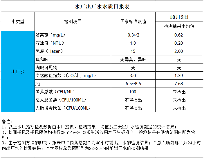 水廠出廠水水質(zhì)日?qǐng)?bào)表(2024-10-2)