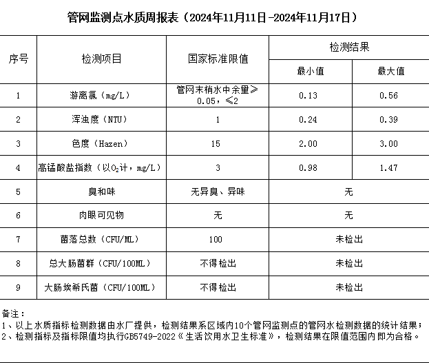 管網(wǎng)監(jiān)測點(diǎn)水質(zhì)周報表(2024年11月11日-2024年11月17日)